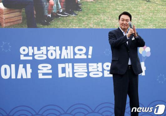 윤석열 대통령이 19일 오후 용산 대통령실 청사 앞 잔디마당에서 열린 대통령실 이전 기념 어린이·주민 초대 행사(부제: 안녕하세요! 새로 이사 온 대통령입니다)에서 환영 인사말을 하고 있다. 대통령실사진기자단 2022.6.19/뉴스1 ⓒ News1 오대일 기자 |