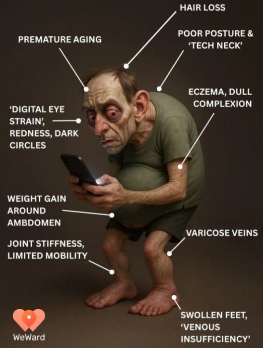 샘은 오랜 좌식 생활과 과도한 스마트폰 사용으로 소모되지 않은 에너지가 지방으로 전환돼 복부에 쌓이면서 체중이 늘고 복부 비만이 생겼다. 더구나 시간이 지나면 심장병과 당뇨병 발병 위험까지 커진다. 또 장시간 앉아 있거나 화면을 보면서 구부정하게 앉아 있었기 때문에 머리는 앞으로 기울어지고 상체는 굽은 데다 거북목으로 변했다. 이는 종종 만성적인 어깨와 목 통증으로 이어진다.