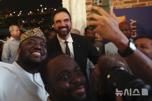 [뉴욕=AP/뉴시스]미국 민주당 뉴욕 시장 후보인 조란 맘다니가 지난 6월25일(현지시각) 당내 경선 승리 이후 지지자들과 사진을 찍고 있다. 2025.11.03. |