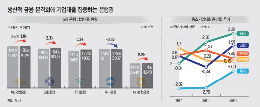 한 시중은행 관계자는 "올해 3~4분기를 정점으로 기업 건전성이 개선될 것으로 예상돼 기업대출 영업 환경이 이전보다 우호적"이라며 "KB금융과 신한금융도 생산적 금융 계획을 준비하고 있어 기업대출 경쟁은 더욱 치열해질 것"이라고 말했다.