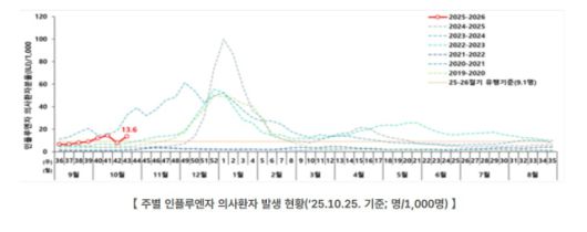 질병관리청은 "남반구 유행 규모와 현재 국내 환자 발생 추세를 고려할 때 이번 절기 인플루엔자 유행은 지난 10년간 정점 규모가 가장 컸던 2024-2025절기와 유사할 가능성이 높다"고 전망했다.