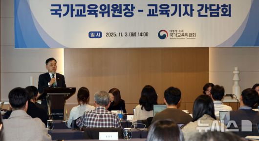 [세종=뉴시스] 강종민 기자 = 차정인 국가교육위원장이 3일 세종시 코트야드 바이 메리어트 세종에서 열린 '국가교육위원장-교육기자 간담회'에서 발언하고 있다. 2025.11.03. ppkjm@newsis.com |