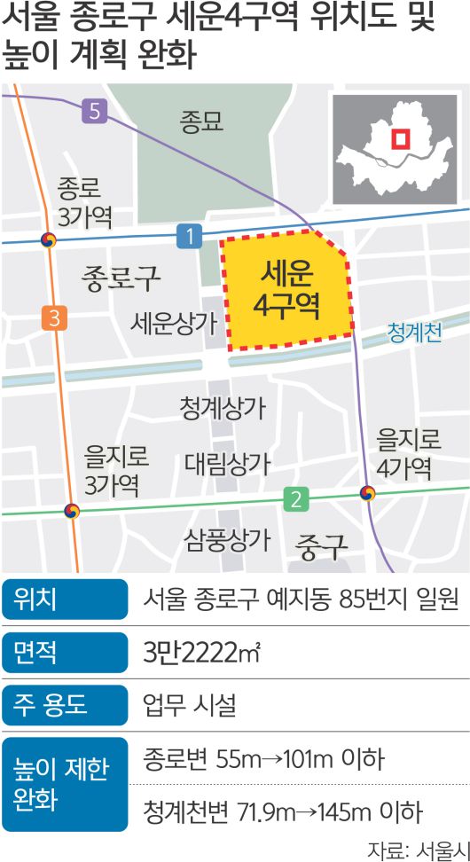 서울시는 지난달 30일 ‘세운재정비촉진지구 및 4구역 재정비촉진계획 결정(변경) 및 지형도면’을 시보에 고시했다고 3일 밝혔다. 세운4구역은 북쪽으로 종묘, 남쪽으로는 청계천과 맞닿아 있는데 이번 변경안 주요 내용은 세운4구역(서울 종로구 예지동 85번지 일원, 면적 3만2222.4㎡)의 건물 최고 높이를 종로변 55m, 청계천변 71.9m에서 각각 종로변 101m 이하, 청계천변 145m 이하로 상향 조정하는 것이다. 청계천변 기준으로 보면 건물 최고 높이가 두 배 가까이 늘어나는 셈이다. 건물에는 업무·판매 시설과 공공기관 시설, 오피스텔 등 주거시설이 들어설 예정이다. 서울시 관계자는 “상가 인구 및 주택 계획은 건축 계획과 경제 상황에 따라 조정될 수 있다”고 설명했다.