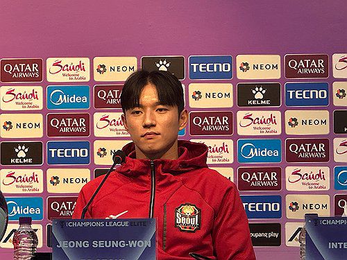 (서울=연합뉴스) 안홍석 기자 = 2025-2026 아시아축구연맹(AFC) 챔피언스리그 엘리트(ACLE) 리그 스테이지 4차전 FC서울과 청두 룽청의 경기를 하루 앞둔 3일 서울월드컵경기장에서 열린 기자회견에 FC서울 정승원이 참석해 있다. 2025.11.3
