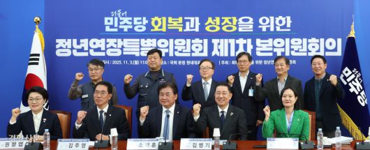 김병기 더불어민주당 원내대표(앞줄 오른쪽)가 3일 국회에서 열린 정년연장특별위원회 제1차 본위원회의에서 소병훈 위원장(앞줄 왼쪽) 등 참석자들과 기념촬영을 하고 있다.