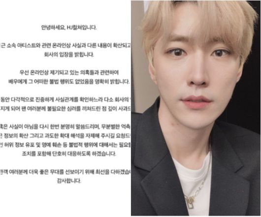 3일 소속사 HJ컬쳐는 공식 입장을 통해 “온라인상 제기되고 있는 김준영 배우 관련 의혹은 사실이 아니다”라며 “그 어떠한 불법 행위도 없었음을 명확히 밝힌다”고 했다.