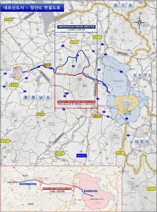 내포신도시~정안IC 연결도로 건설 사업은 2020년 5월 행복청의 ‘행복도시 광역교통 개선 대책(3차)’에 반영됐으나 2020년 6월, 2021년 1월, 2025년 6월 시급성 부족 및 혁신도시 공공기관 이전 미확정 등의 사유로 예타 대상에서 선정되지 못했다.