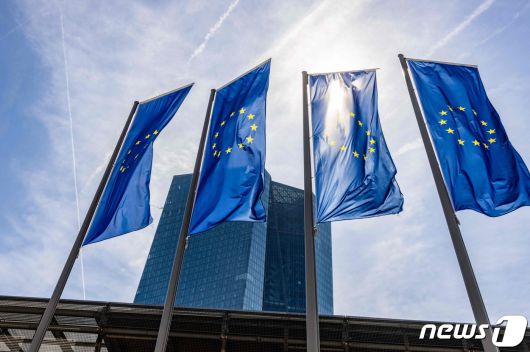 독일 프랑크푸르트 유럽중앙은행(ECB) 앞에 유럽연합(EU) 깃발이 바람에 펄럭이고 있다. 2023.05.04/ ⓒ AFP=뉴스1 |