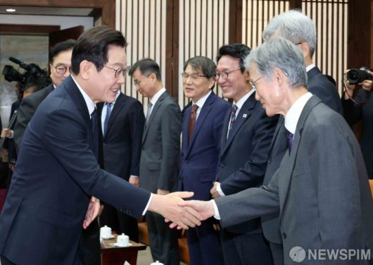 [서울=뉴스핌] 윤창빈 기자 = 시정연설을 위해 국회를 방문한 이재명 대통령(왼쪽)이 4일 국회의장접견실에서 열린 환담에서 조희대 대법원장(오른쪽)과 악수하고 있다. 2025.11.04 pangbin@newspim.com