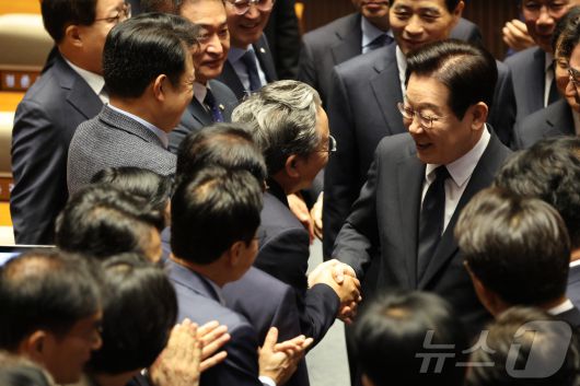 (서울=뉴스1) 국회사진기자단 = 이재명 대통령이 4일 서울 여의도 국회 본회의에서 내년도 정부 예산안에 대한 시정연설을 마치고 의원들의 박수를 받으며 퇴장하고 있다. 2025.11.4/뉴스1