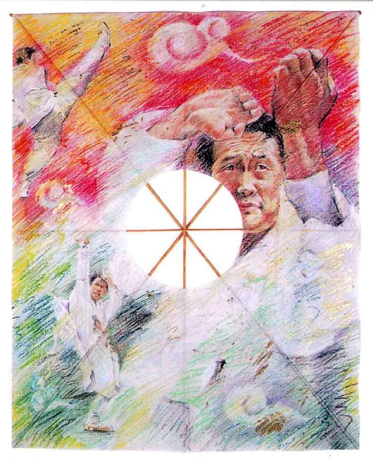 방패연 속 '택견'은 우리 전통무예의 생명력을 회화로 형상화한 역동적 걸작이다. 춤추듯 능청거리며 발로 차고 상대를 걸어 넘어뜨리는 택견의 곡선 동작이 주황 불꽃과 분홍 회오리로 화폭을 휘감으며 솟구친다. 디자인 작가 노호룡은 중앙의 수련자 형상을 중심으로 사방팔방 터져 나가는 격렬한 기운을 포착해, 마치 대지를 박차고 창공으로 날아오르는 방패연처럼 강인한 생명력을 시각화했다.