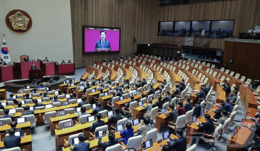 (서울=뉴스1) 국회사진기자단 = 이재명 대통령이 4일 오전 국회 본회의장에서 열린 제11차 본회의에서 내년도 예산안 관련 시정연설을 하고 있다. 20251104 2025.11.4/뉴스12expulsion@news1.krCopyright ⓒ 뉴스1. All rights reserved. 무단 전재 및 재배포, AI학습 이용 금지.