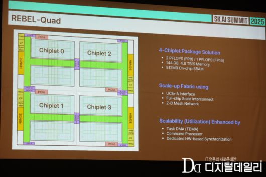 리벨리온은 이날 발표에서 AI 대형모델(LLM) 추론을 위한 '칩렛 기반 NPU(Neural Processing Unit)' 구조를 처음으로 공개했다. 핵심 제품인 리벨 쿼드는 자체 설계한 칩렛 '리벨(REBEL)' 4개를 하나의 패키지로 통합한 형태로 2 PFLOPS(페타플롭스) 연산 성능, 144GB의 HBM3 메모리, 4.8TB/s 메모리 대역폭을 제공한다.