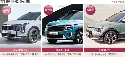 2일 완성차 업계에 따르면 기아는 내년부터 화성·광주공장 두 곳에서 셀토스 하이브리드 신규 모델을 본격 생산하기로 했다. 화성공장에서는 상품성을 개선한 니로 하이브리드 모델 라인업도 추가 생산한다. 올해 말부터는 광주공장에서 스포티지 하이브리드 생산 비율을 점진적으로 확대하는 방안도 확정했다.