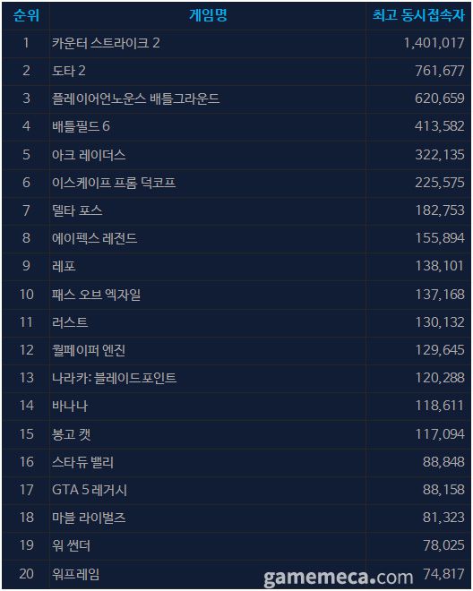 ▲ 11월 4일 오후 5시 기준 스팀 일 최고 동시접속자 TOP 20 (자료출처: 스팀) |