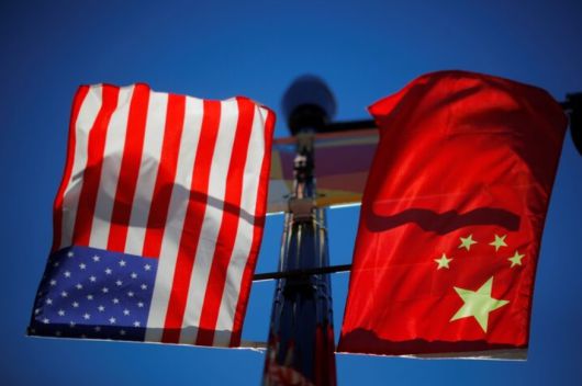 미국 성조기(왼쪽)과 중국 오성홍기가 바람에 펄럭이고 있다. [로이터] |