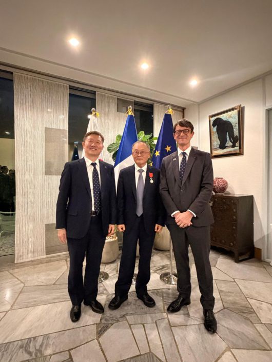 최근 프랑스 정부로부터 레지옹 도뇌르 훈장을 받은 이상률 전 항공우주연구원 원장(가운데)과 이상철 항우연 원장(왼쪽), 필립 베르투 주한프랑스대사가 기념촬영을 하고 있다. 한국항공우주연구원 제공 |