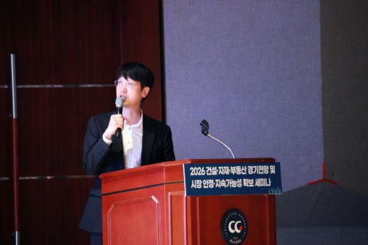 김성환 한국건설산업연구원 연구위원이 4일 열린 '2026년 건설·자재·부동산 경기전망 및 시장 안정·지속가능성 확보 세미나'에서 내년도 부동산 경기 전망을 발표하고 있다. [사진=한국건설산업연구원] |
