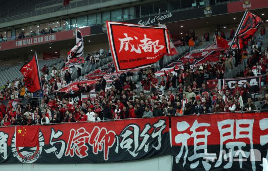 [서울=뉴시스] 조성우 기자 = 4일 오후 서울 마포구 서울월드컵경기장에서 열린 2025-2026 아시아축구연맹(AFC) 챔피언스리그 엘리트(ACLE) 리그 스테이지 4차전 FC서울과 청두 룽청의 경기, 청두 서포터즈가 열띤 응원전을 펼치고 있다. 2025.11.04. xconfind@newsis.com