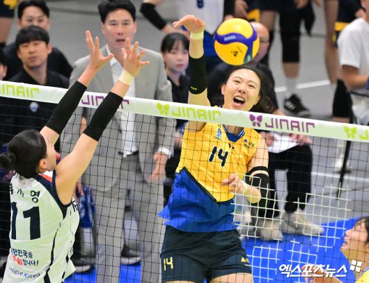 (엑스포츠뉴스 수원, 김한준 기자) 4일 오후 경기도 수원실내체육관에서 열린 진에어 2025-2026 V-리그 현대건설과 기업은행의 경기, 현대건설 양효진이 공격을 시도하고 있다.김한준 기자 kowel@xportsnews.com
