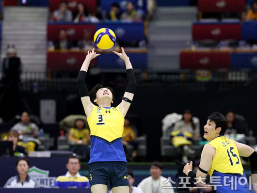 [수원=스포츠투데이 팽현준 기자] 4일 경기도 수원실내체육관에서 열린 V리그 여자부 현대건설과 IBK기업은행의 경기, 현대건설 김다인이 토스하고 있다. 2025.11.04. [스포츠투데이 팽현준 기자 sports@stoo.com]