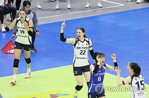 (수원=연합뉴스) 홍기원 기자 = 4일 경기도 수원실내체육관에서 열린 프로배구 V리그 여자부 현대건설 힐스테이트와 IBK기업은행 알토스의 경기. 득점에 성공한 IBK기업은행 선수들이 기뻐하고 있다. 2025.11.4