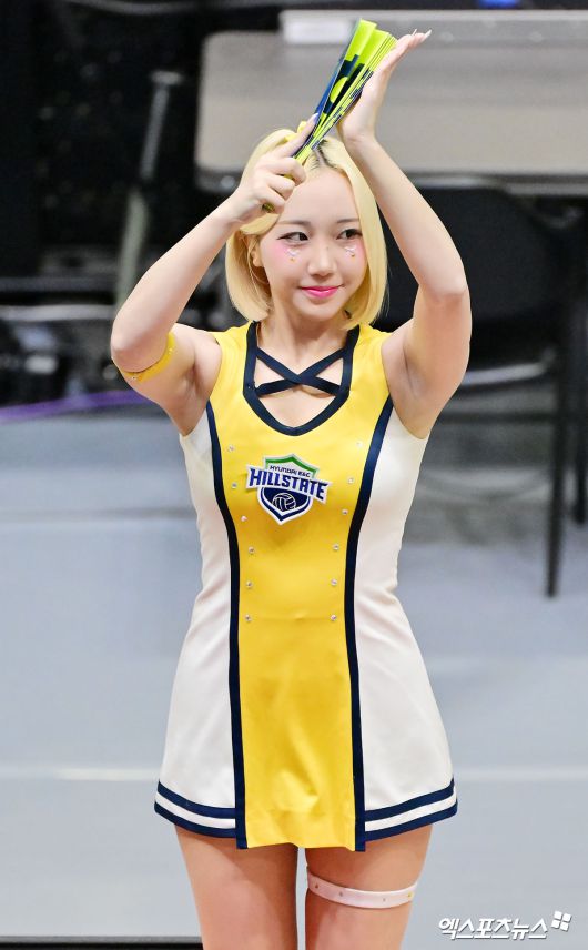 (엑스포츠뉴스 수원, 김한준 기자) 4일 오후 경기도 수원실내체육관에서 열린 진에어 2025-2026 V-리그 현대건설과 기업은행의 경기, 현대건설이 기업은행에 세트스코어 3:0(25-20 25-20 25-22)으로 승리했다. 현대건설 박성은 치어리더가 열띤 응원을 선보이고 있다.김한준 기자 kowel@xportsnews.com