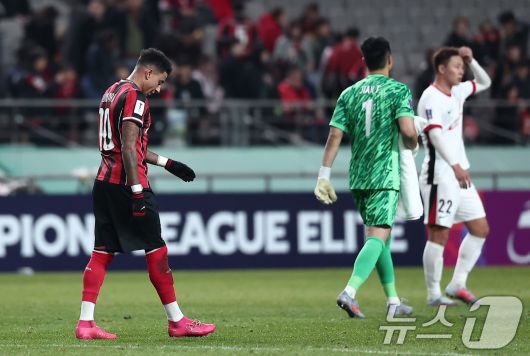(서울=뉴스1) 김성진 기자 = FC서울 제시 린가드가 4일 서울 마포구 서울월드컵경기장에서 열린 '2025-2026 아시아축구연맹(AFC) 챔피언스리그 엘리트(ACLE)' 리그 스테이지 4차전 FC서울과 청두 룽청의 경기에서 0-0 무승부를 기록한 후 아쉬워하고 있다. 2025.11.4/뉴스1