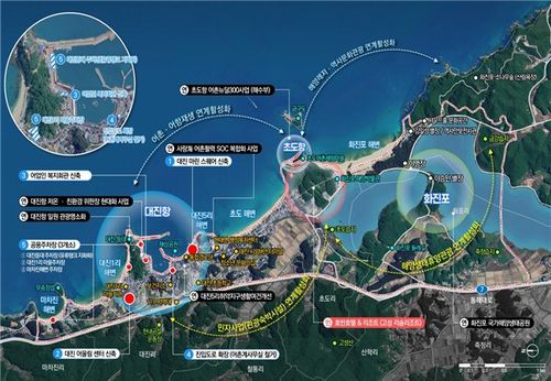 고성 대진항은 인근 화진포 리조트 개발과 연계해 수산물 가공·유통시설과 관광 인프라를 구축, 민자사업과 어촌이 상생하는 강원 북부권의 해양산업·관광 복합경제 거점으로 육성한다.