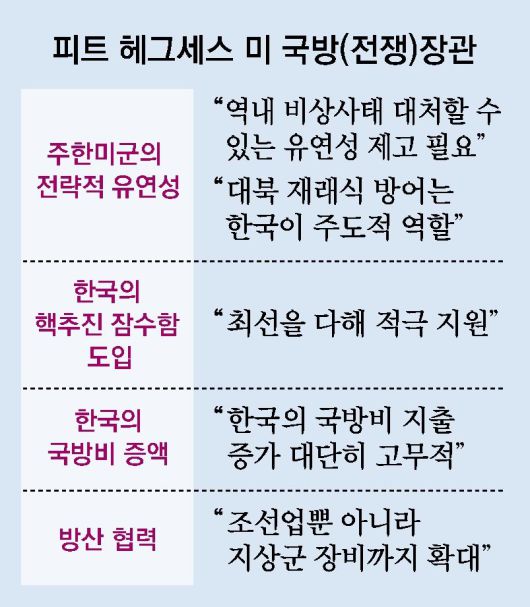 헤그세스 장관은 한국에 핵억제(nuclear deterrence·확장억제)는 계속 제공할 것이라면서도 대북 재래식 방어는 한국이 주도해야 한다고도 했다. 군 관계자는 “조만간 발표될 미국의 새 국가방위전략(NDS)에 주한미군의 중국 견제 역할을 강화하고, 한국이 대북 안보를 사실상 전담하는 내용이 포함될 것임을 예고한 것”이라고 말했다.