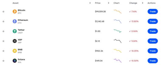 5일(한국시간) 오전 6시 50분 기준, 글로벌 거래소 코인베이스에 따르면 비트코인(BTC)은 9만9559.38달러에 거래되고 있다. 전일 대비 7.16% 하락한 수준이다.