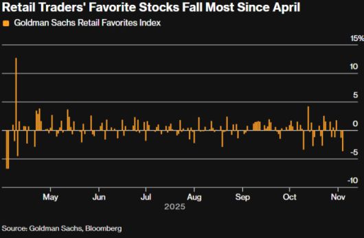 가장 인기 있는 주식에 몰려드는 데이 트레이더들에게 화요일은 도널드 트럼프의 무역전쟁이 촉발한 4월 혼란 이후 최악의 장이었다. 골드만삭스그룹의 리테일 페이버릿 인덱스, 비전문 트레이더들이 대거 보유한 주식 바스켓은 팔란티어 테크놀로지스의 실망스러운 실적 보고서와 유명 헤지펀드 매니저가 지난 분기 이 주식과 반도체 제조사 엔비디아에 약세 베팅을 했다는 공시가 나온 후 특히 심한 타격을 받았다.