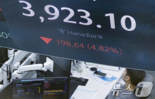 (서울=뉴스1) 박정호 기자 = 5일 오전 서울 중구 하나은행 딜링룸에 코스피 시황이 표시되고 있다. 이날 코스피는 66.27p 하락하며 출발해 장중 4000선이 붕괴됐다. 2025.11.5/뉴스1pjh2035@news1.krCopyright ⓒ 뉴스1. All rights reserved. 무단 전재 및 재배포, AI학습 이용 금지.