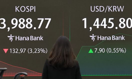 5일 서울 중구 하나은행 본점 딜링룸 현황판에 코스피, 원/달러 환율, 코스닥 지수가 표시되고 있다. 이날 코스피는 전 거래일보다 66.27포인트 내린 4055.47로 시작해 장중 4000선 아래로 떨어졌다. 연합뉴스 |