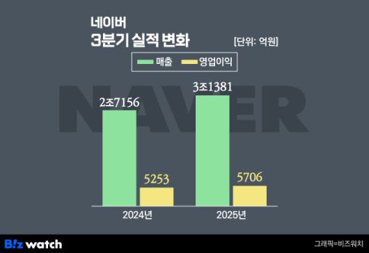 네이버는 '온서비스 AI' 전략의 성과에 힘입어 올해 3분기 역대 최고 실적을 기록했다./그래픽=비즈워치 |