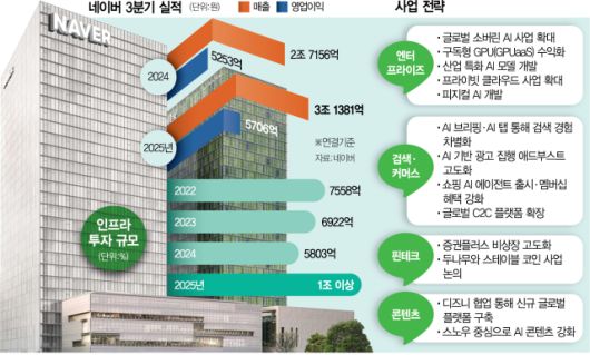 네이버가 인공지능(AI) 에이전트와 피지컬AI 사업 확대를 위해 내년부터 AI 칩에만 1조원 이상의 자본투자(CAPEX)를 단행한다. 기존 서비스에 AI를 접목한 결과 올 3분기 매출이 사상 처음으로 3조원을 돌파하는 등 AI를 통한 사업 확대 가능성을 확인하면서다.
