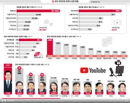 그러면 가장 열심히 유튜브 활동을 하는 의원들은 누굴까. 정당별로 살펴보면 민주당의 평균 게시물 수는 595.4건, 국민의힘은 399.1건이었다. 여당 의원들이 야당 의원보다 훨씬 유튜브 활동에 적극적인 것이다.