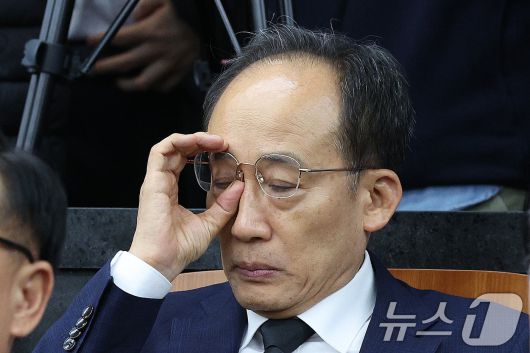 구속영장이 청구된 추경호 국민의힘 의원이 4일 서울 여의도 국회에서 열린 의원총회에서 안경을 고쳐쓰고 있다./뉴스1 ⓒ News1 신웅수 기자 |