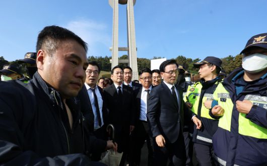 장동혁 국민의힘 대표가 6일 오후 광주 북구 국립5·18민주묘지에서 시민단체의 반발로 참배를 하지 못하고 발길을 돌리고 있다. 참배 시도 과정에서 장 대표 지지자들과 시민단체 회원들 사이에서 서로 밀치거나 고성이 오가는 등 충돌이 빚어졌다. 연합뉴스 |