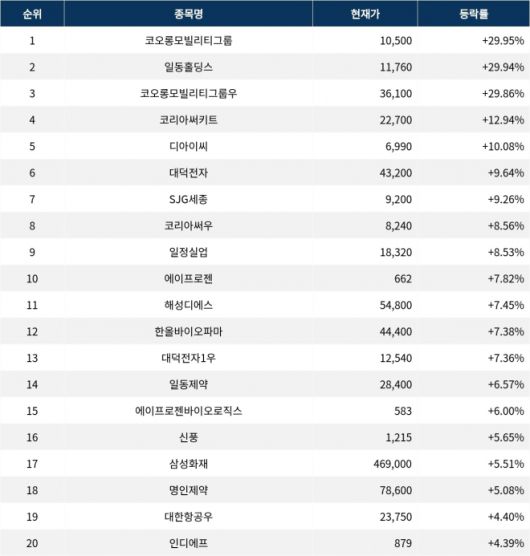 6위 대덕전자(353200)는 종가 43,200원으로 +9.64% 상승 마감했다. 7위 SJG세종(033530)은 종가 9,200원으로 +9.26% 상승 마감했다. 8위 코리아써우(007815)는 종가 8,240원으로 +8.56% 상승 마감했다. 9위 일정실업(008500)은 종가 18,320원으로 +8.53% 상승 마감했다. 10위 에이프로젠(007460)은 종가 662원으로 +7.82% 상승 마감했다.