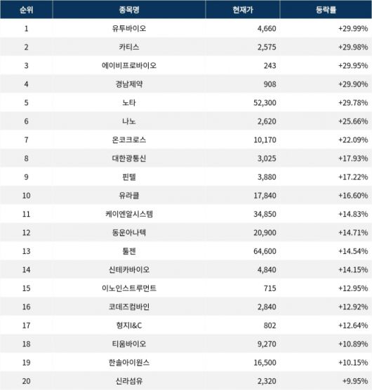 6위 나노(187790)는 종가 2,620원으로 25.66% 급등 마감했다. 7위 온코크로스(382150)는 종가 10,170원으로 22.09% 급등 마감했다. 8위 대한광통신(010170)은 종가 3,025원으로 17.93% 급등 마감했다. 9위 핀텔(291810)은 종가 3,880원으로 17.22% 급등 마감했다. 10위 유라클(088340)은 종가 17,840원으로 16.60% 급등 마감했다.