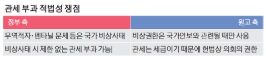 정부 측 법률 대리인 존 사우어 법무차관은 트럼프 대통령이 비상 권한을 사용한 것은 무역적자가 미국을 경제·국가안보적 재앙 직전의 상태로 몰아넣고 있다고 판단했기 때문이라고 설명했다. 반면, 소송을 제기한 중소기업들을 대리하는 닐 카티알 변호사는 이에 맞서 “관세는 곧 세금”이라며 “(헌법을 만든) 우리 건국자들은 과세 권한을 오로지 의회에만 부여했다”고 반박했다.