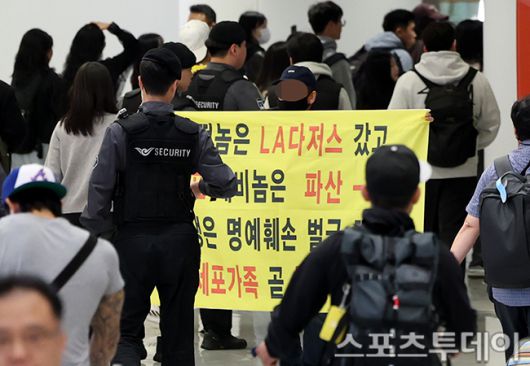 그런데 귀국 현장에서 진행된 인터뷰에서 예상치 못한 상황이 발생했다. 한 남성이 인터뷰 현장 부근에서 현수막을 펼친 것이다. 현수막에는 김혜성 아버지의 채무와 관련된 내용이 적혀 있었다.