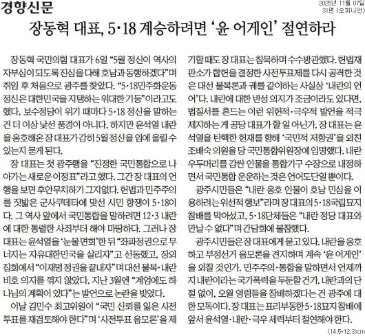 경향 = 장동혁 대표, 5·18 계승하려면 '윤 어게인' 절연하라