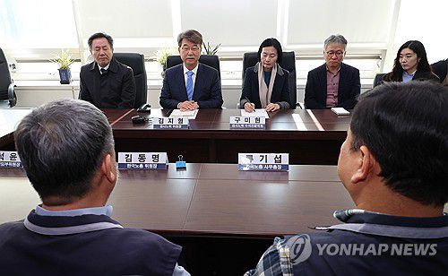 (서울=연합뉴스) 김주형 기자 = 김지형 신임 경제사회노동위원회 위원장(왼쪽 두번째)이 7일 서울 여의도 한국노총을 방문해 김동명 한국노총 위원장 등과 간담회 하고 있다. 2025.11.7