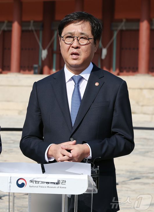(서울=뉴스1) 김진환 기자 = 최휘영 문화체육관광부 장관이 7일 오후 서울 종묘 정전 하월대에서 종묘 앞 개발 관련 대법원 판결과 관련해 입장을 밝히고 있다. 앞서 대법원은 지난 6일 국가유산청(옛 문화재청)과 사전 협의 없이 문화재 외곽 지역 개발규제를 완화한 서울시 조례 개정은 정당하다고 판단을 내린 바 있다. 2025.11.7/뉴스1