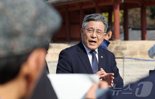 (서울=뉴스1) 김진환 기자 = 허민 국가유산청장이 7일 오후 서울 종묘 정전 하월대에서 종묘 앞 개발 관련 대법원 판결과 관련해 입장을 밝히고 있다. 앞서 대법원은 지난 6일 국가유산청(옛 문화재청)과 사전 협의 없이 문화재 외곽 지역 개발규제를 완화한 서울시 조례 개정은 정당하다고 판단을 내린 바 있다. 2025.11.7/뉴스1