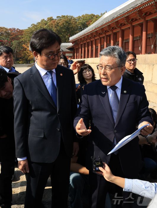 (서울=뉴스1) 김진환 기자 = 최휘영 문화체육관광부 장관과 허민 국가유산청장(오른쪽)이 7일 오후 종묘 앞 개발 관련 대법원 판결과 관련한 입장을 밝히기에 앞서 서울 종묘 정전 하월대를 점검하고 있다. 앞서 대법원은 지난 6일 국가유산청(옛 문화재청)과 사전 협의 없이 문화재 외곽 지역 개발규제를 완화한 서울시 조례 개정은 정당하다고 판단을 내린 바 있다. 2025.11.7/뉴스1