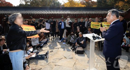 (서울=뉴스1) 김진환 기자 = 허민 국가유산청장이 7일 서울 종묘 정전 하월대에서 종묘 앞 개발 규제 완화 관련 대법원 판결에 대한 입장 발표 기자회견 중 세운 4구역 주민 등에게 항의를 받고 있다. 앞서 대법원은 지난 6일 국가유산청(옛 문화재청)과 사전 협의 없이 문화재 외곽 지역 개발규제를 완화한 서울시 조례 개정은 정당하다고 판단을 내린 바 있다. 2025.11.7/뉴스1