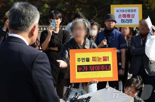 (서울=뉴스1) 김진환 기자 = 허민 국가유산청장이 7일 서울 종묘 정전 하월대에서 종묘 앞 개발 규제 완화 관련 대법원 판결에 대한 입장 발표 기자회견 중 세운 4구역 주민들의 항의를 받고 있다. 앞서 대법원은 지난 6일 국가유산청(옛 문화재청)과 사전 협의 없이 문화재 외곽 지역 개발규제를 완화한 서울시 조례 개정은 정당하다고 판단을 내린 바 있다. 2025.11.7/뉴스1